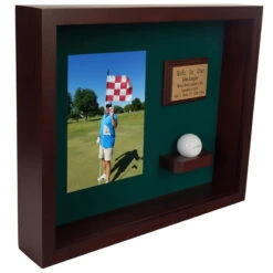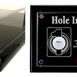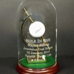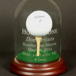 This unique Hole-In-One trophy features 2 glass domes resting on a beautiful custom made wood base. Tees are provided to display your prized golf balls. Ball not included.