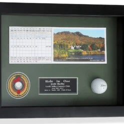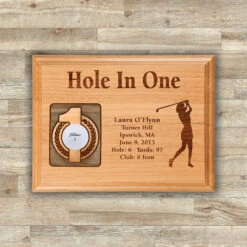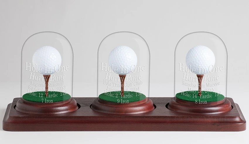 Organize your collection of Glass Dome Hole In One Displays with this solid walnut, cherry-stained based. Designed to fit 3 Glass Dome with Tee Hole-In-One Trophies.