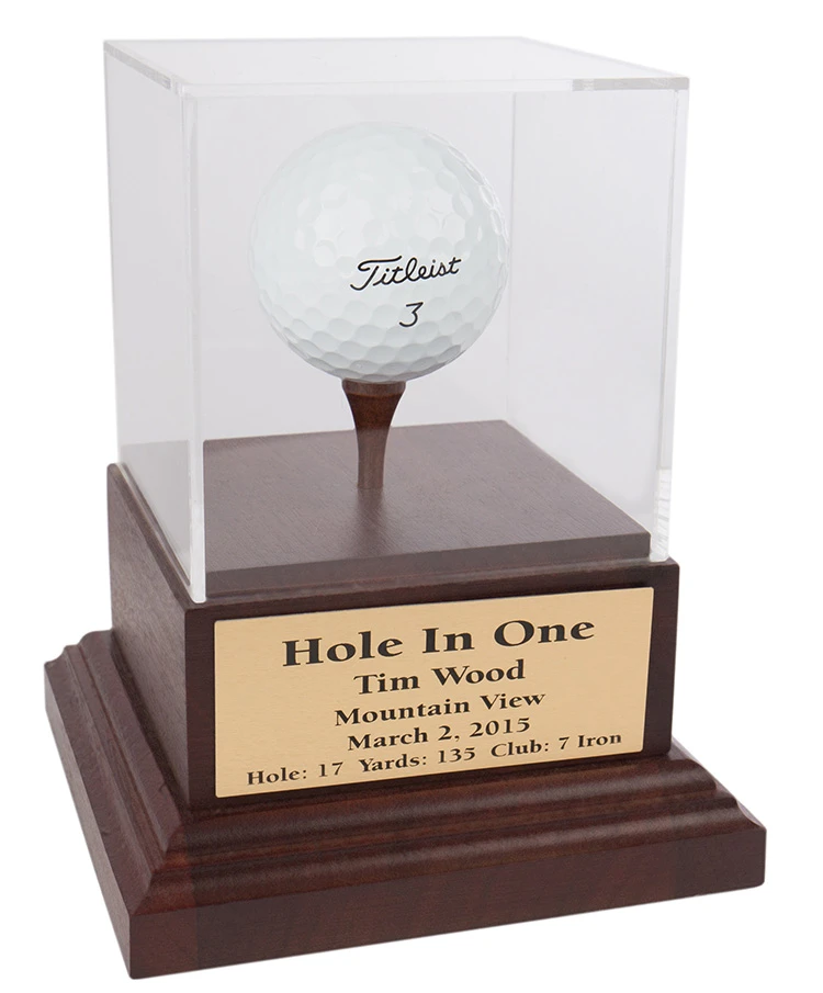 Handcrafted out of solid hardwood, this hole-in-one golf ball display will be an elegant trophy for one of your greatest golf achievements. Resting atop a golf tee protected by an acrylic box, your hole-in-one ball will proudly stand as a testament to your love of the game. Available in cherry and black finishes, the engraved brass plate (choose from either black with gold text, or gold with black text) can be customized to include name, course, date, hole number, hole yardage and the club used.