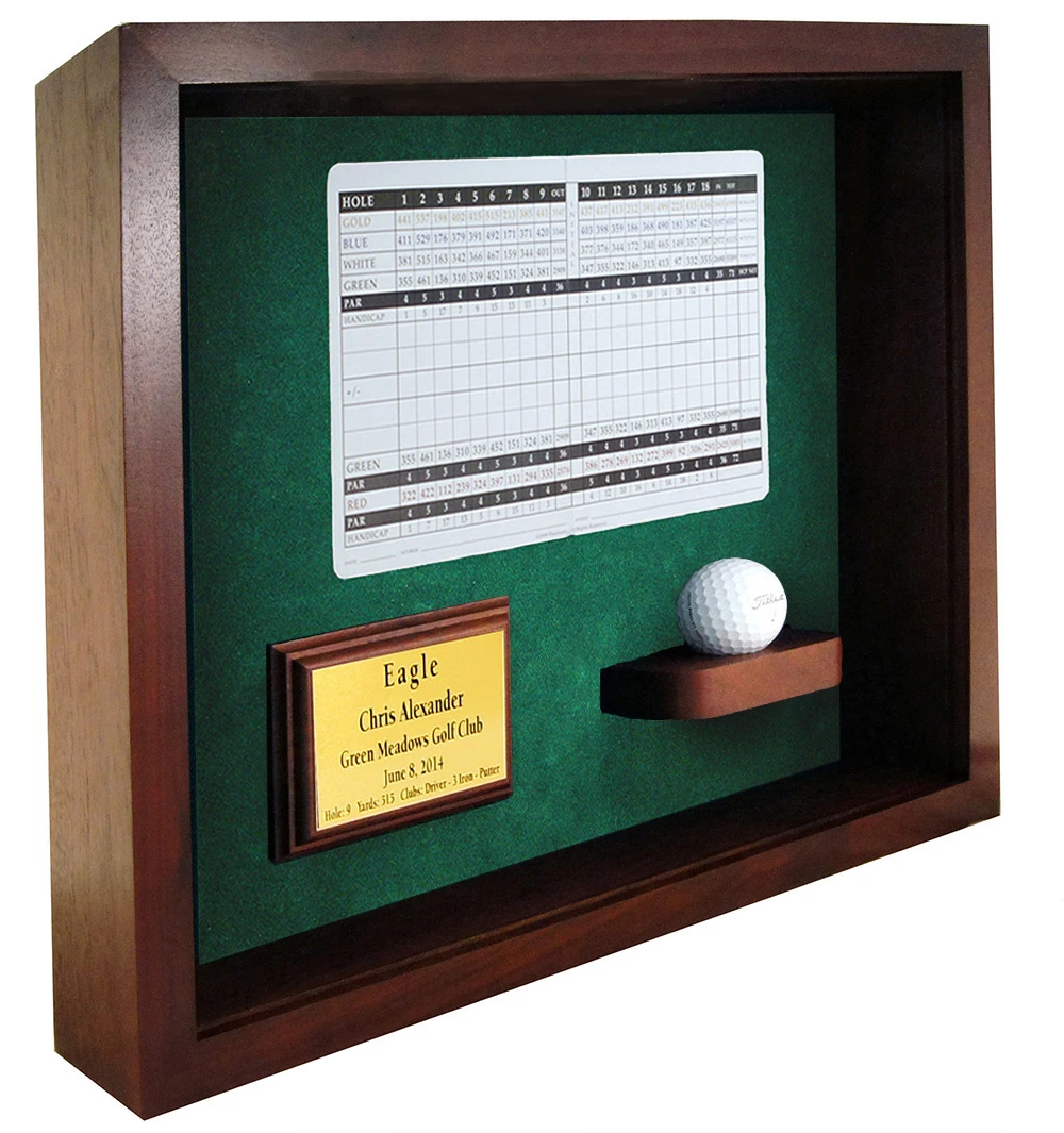 This Ball & Scorecard Shadow Box will attractively display your Eagle, Double Eagle, Best Round, or Albatross. Acrylic cover slides in from the top, and the display can stand alone or be hung from wall. The scorecard is held in place by four Velcro tabs-provided.