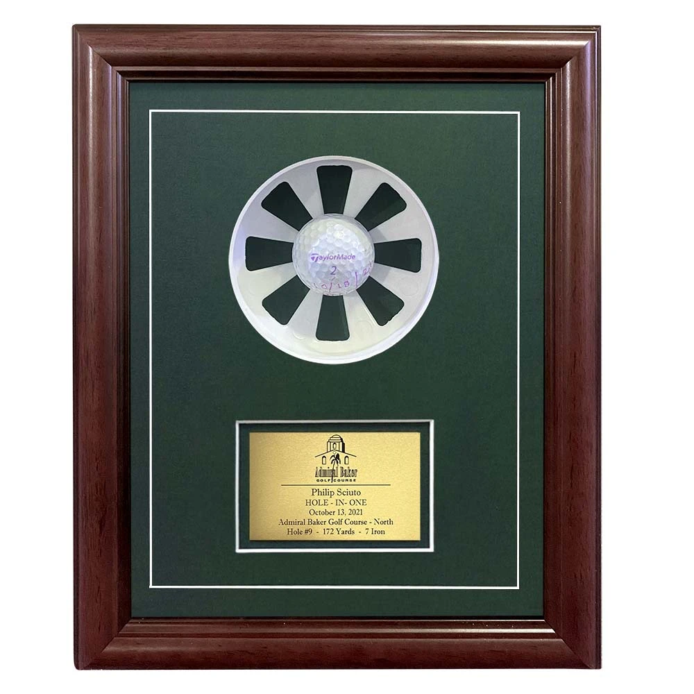 Display the hole in one ball in this attractive red mahogany finished custom-framed shadow box. Includes free engraving and shipping. Your ball will be permanently mounted in the cup and details engraved on a brass plate. Shadow box measures 10″ H x 7.5″ W x 3″ D.