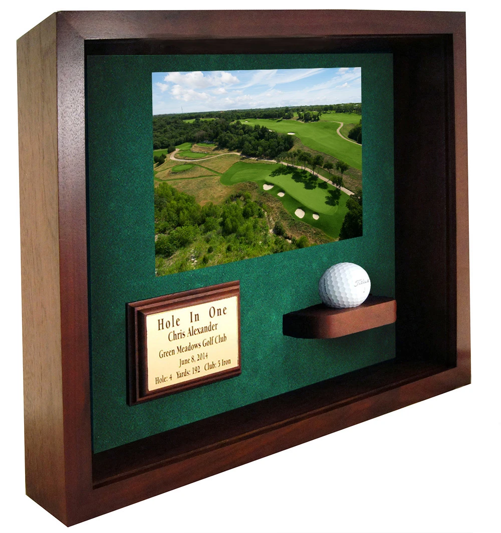 This classic Hole-In-One display case is custom made in the USA. Acrylic cover slides in from the top, and the display can stand alone or be hung from wall. Your scorecard or photo is held in place by four Velcro tabs- that are provided.