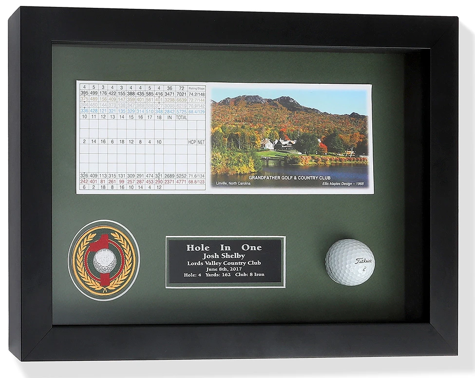 This beautiful Hole-In-One Display case is custom made in the USA and includes an embroidered Hole-In-One patch. Crafted from composite wood, this black case is enclosed in plexiglass and can be hung or stand on a shelf. Scorecard or photo is mounted with adhesive strips that are included. This display is perfect for any office, den, or man cave.