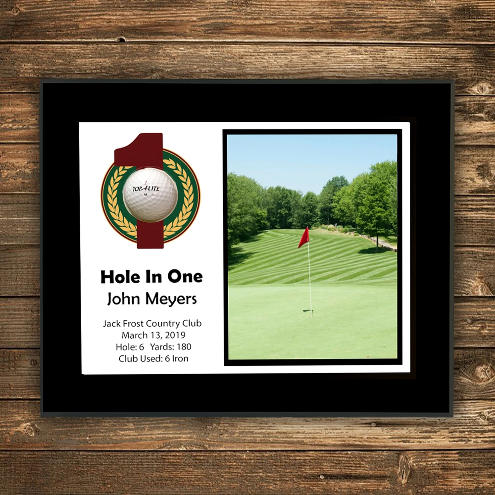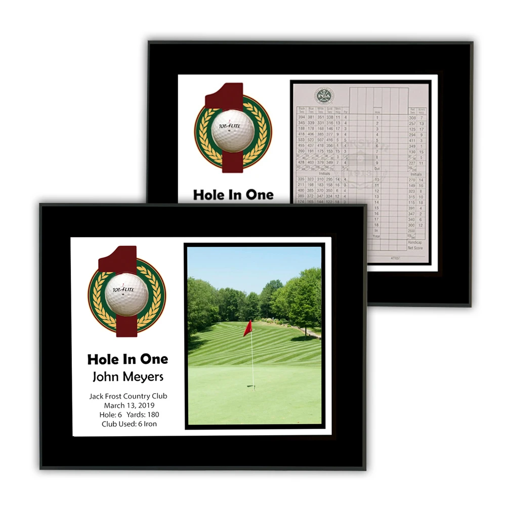 Our custom laminated Hole In One Plaque provides an attractive alternative to framing and a permanent safeguard against deterioration. Each plaque is hand-worked through a 26-step process that blends advanced technological skill with traditional New England craftsmanship. All plaques have a deluxe beveled edge and a beautiful glossy finish that will incorporate you scorecard or photo seamlessly into the product.
