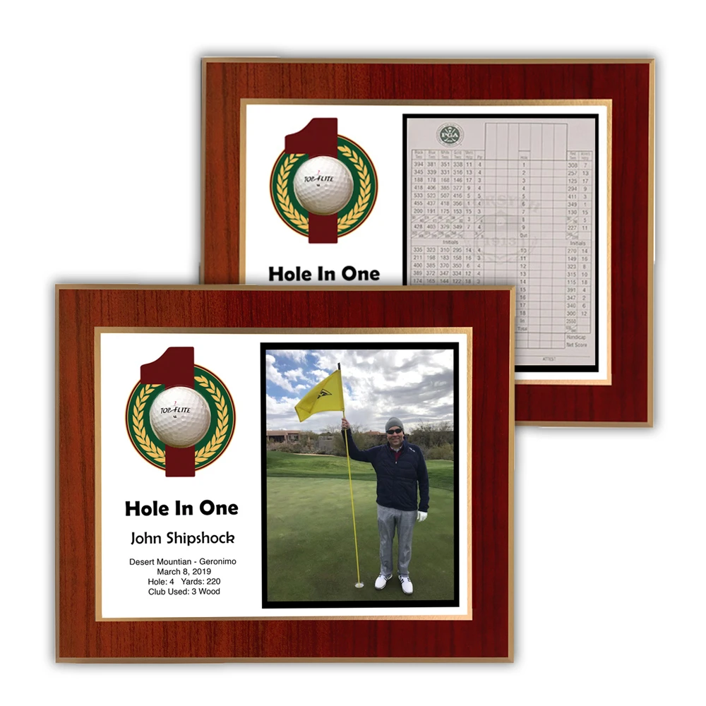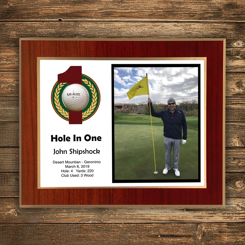 Our custom laminated Hole In One Plaque provides an attractive alternative to framing and a permanent safeguard against deterioration. Each plaque is hand-worked through a 26-step process that blends advanced technological skill with traditional New England craftsmanship. All plaques have a deluxe beveled edge and a beautiful glossy finish that will incorporate you scorecard or photo seamlessly into the product.