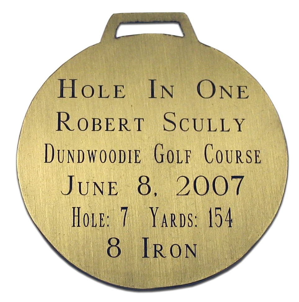 This attractive brass Hole-In-One bag tag will look great on your golf bag. Engraved with the details of your hole in one on the backside, it will be the envy of other golfers.