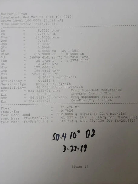 SD-4 12″ : 0.8-1.0 ft^3 sealed (Qtc range 0.97-1.1) – F3 ~42Hz — Depth 5.0″