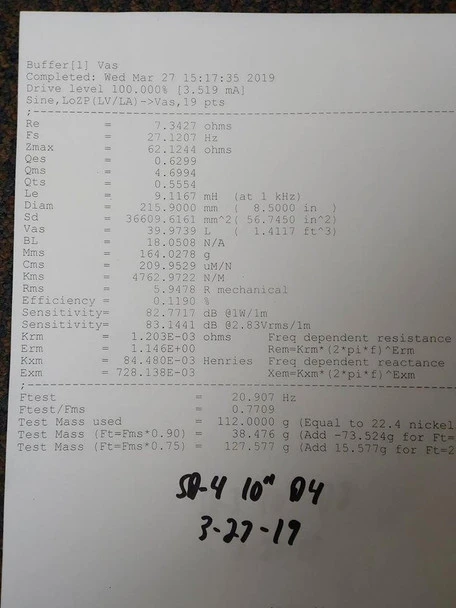 SD-4 12″ : 0.8-1.0 ft^3 sealed (Qtc range 0.97-1.1) – F3 ~42Hz — Depth 5.0″